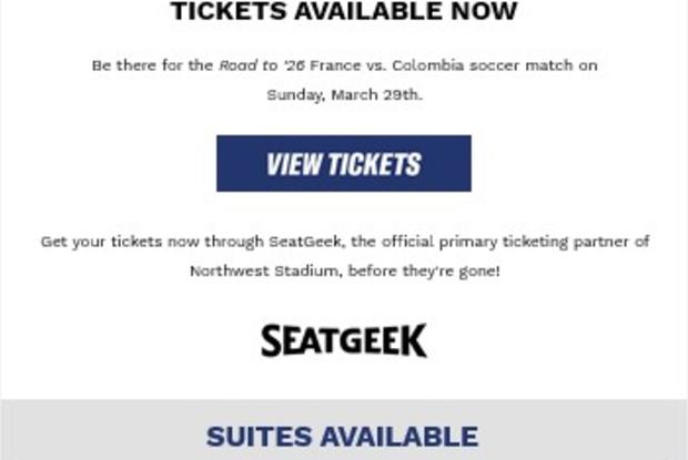 Be there for the Road to '26 France vs. Colombia soccer match on Sunday, March 29th. Get your tickets now through SeatGeek, the official primary ticketing partner of Northwest Stadium, before they're gone!